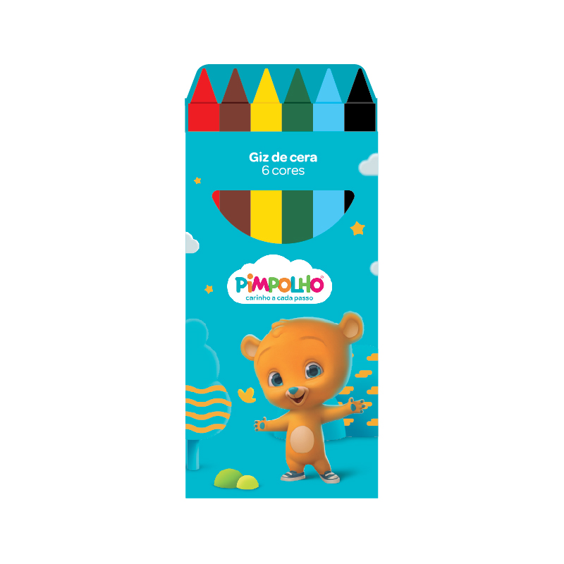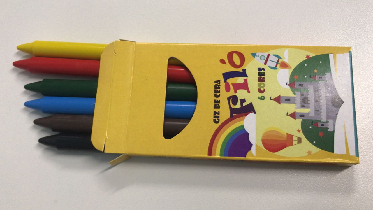 Caixa em cartão triplex 250g personalizado em cromia 4×0 cores contendo 6 giz de cera nas cores preto, vermelho, amarelo, azul, verde e marrom. Tamanho 50 x 95 x 9 mm.