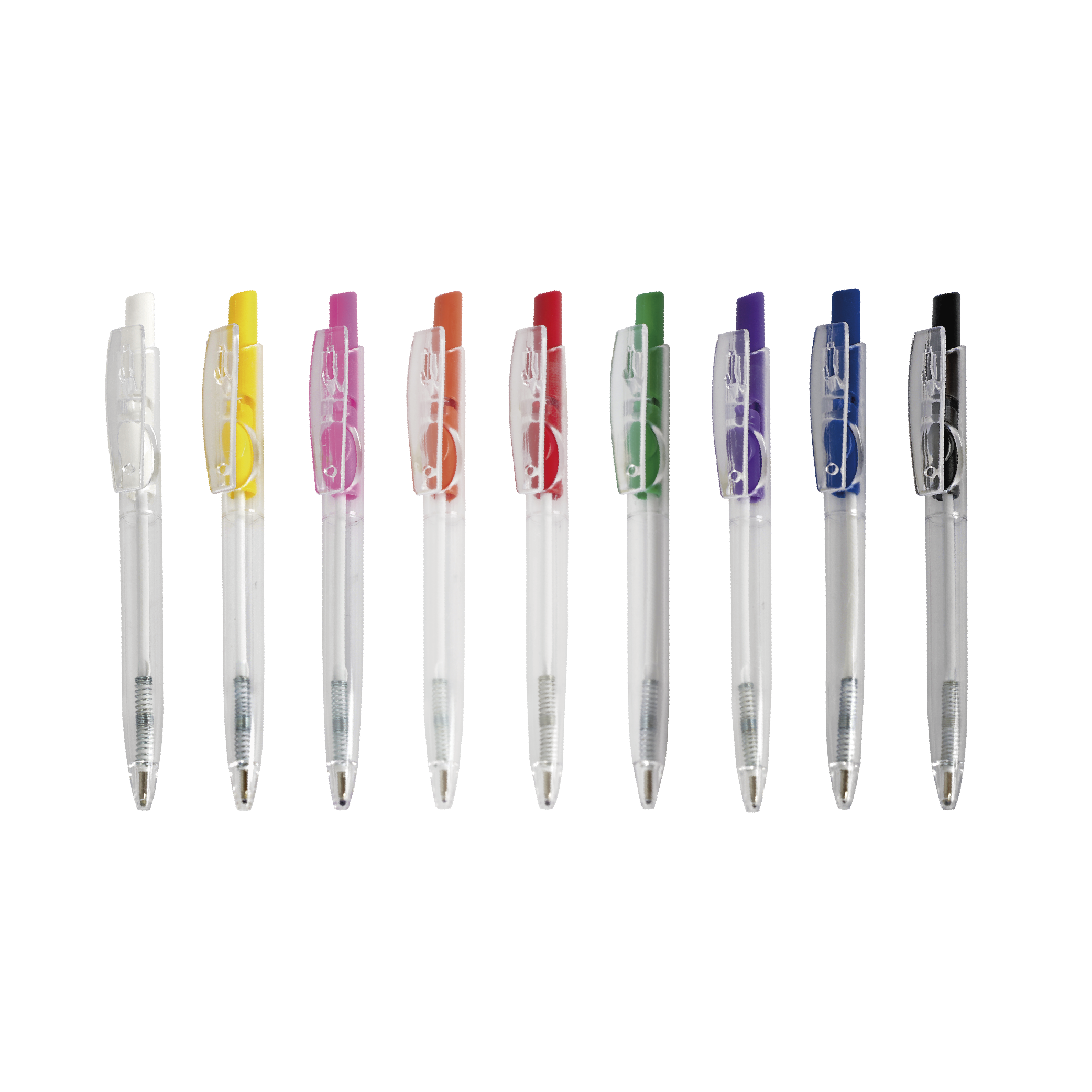 Caneta plástica cristal com detalhes no acionador e destravador colorido. Aciona por clique e para destravar basta apertar a parte inferior do clip.
